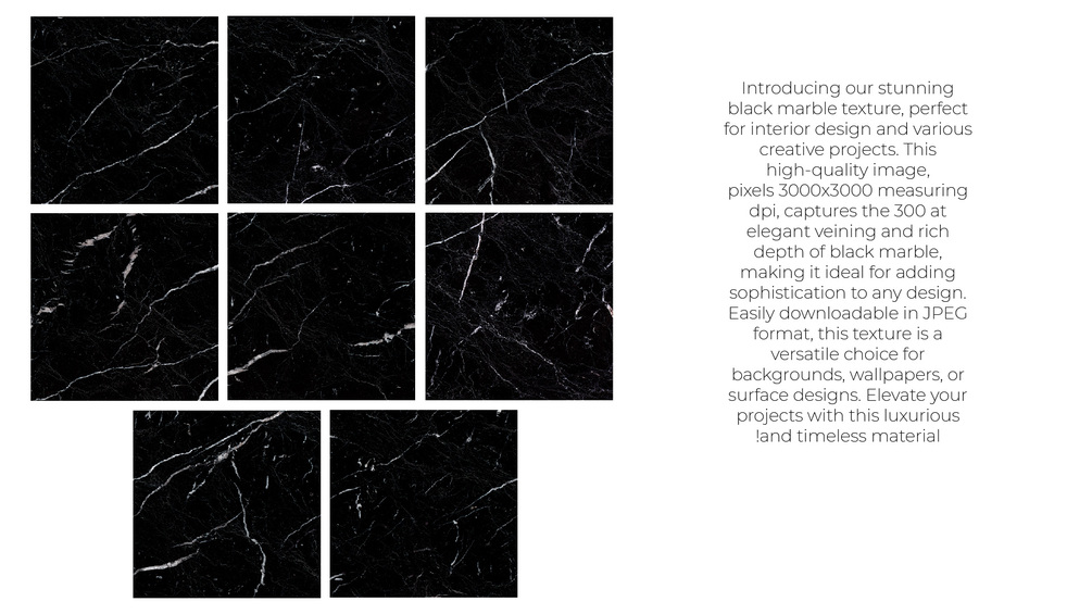 Introducing our stunning black marble texture, perfect for interior design and various creative projects. This high-quality image, measuring 3000x3000 pixels at 300 dpi, captures the elegant veining and rich depth of black marble, making it ideal for adding sophistication to any design. Easily downloadable in JPEG format, this texture is a versatile choice for backgrounds, wallpapers, or surface designs. Elevate your projects with this luxurious and timeless material!